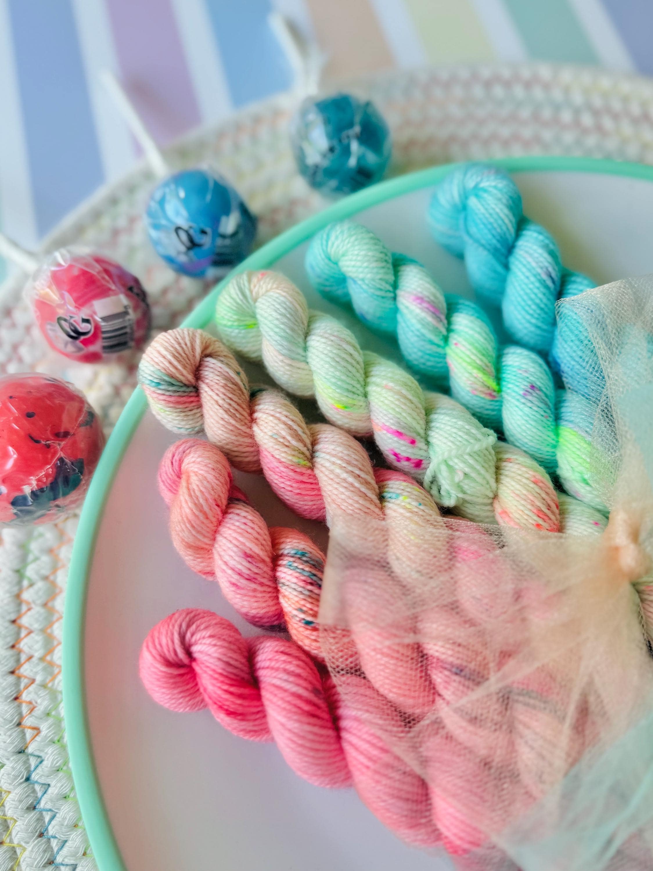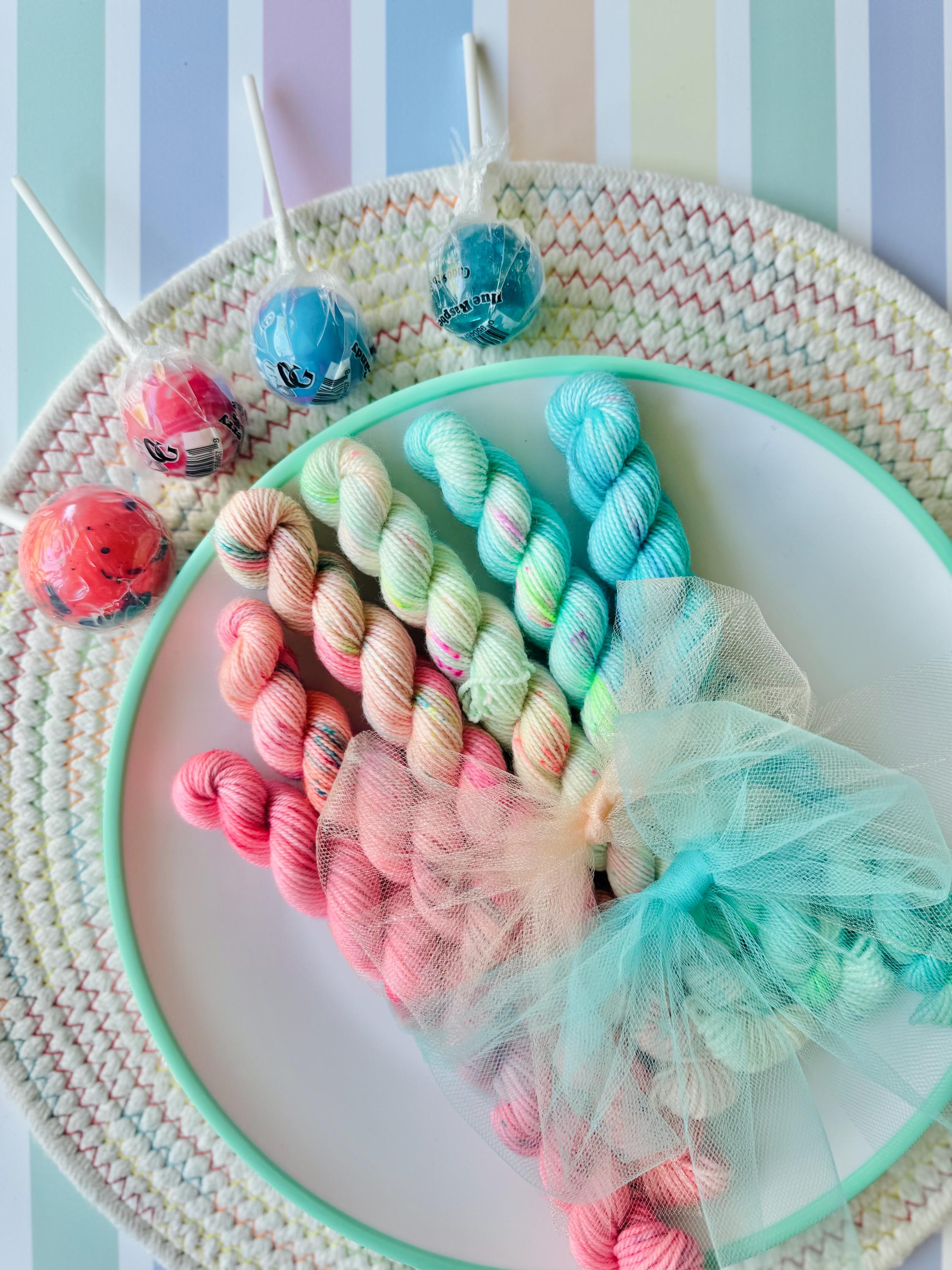 Step back in time with my Lollipop Lane collection of mini skeins, where the colors of yarn are as sweet as the confections behind the counter!