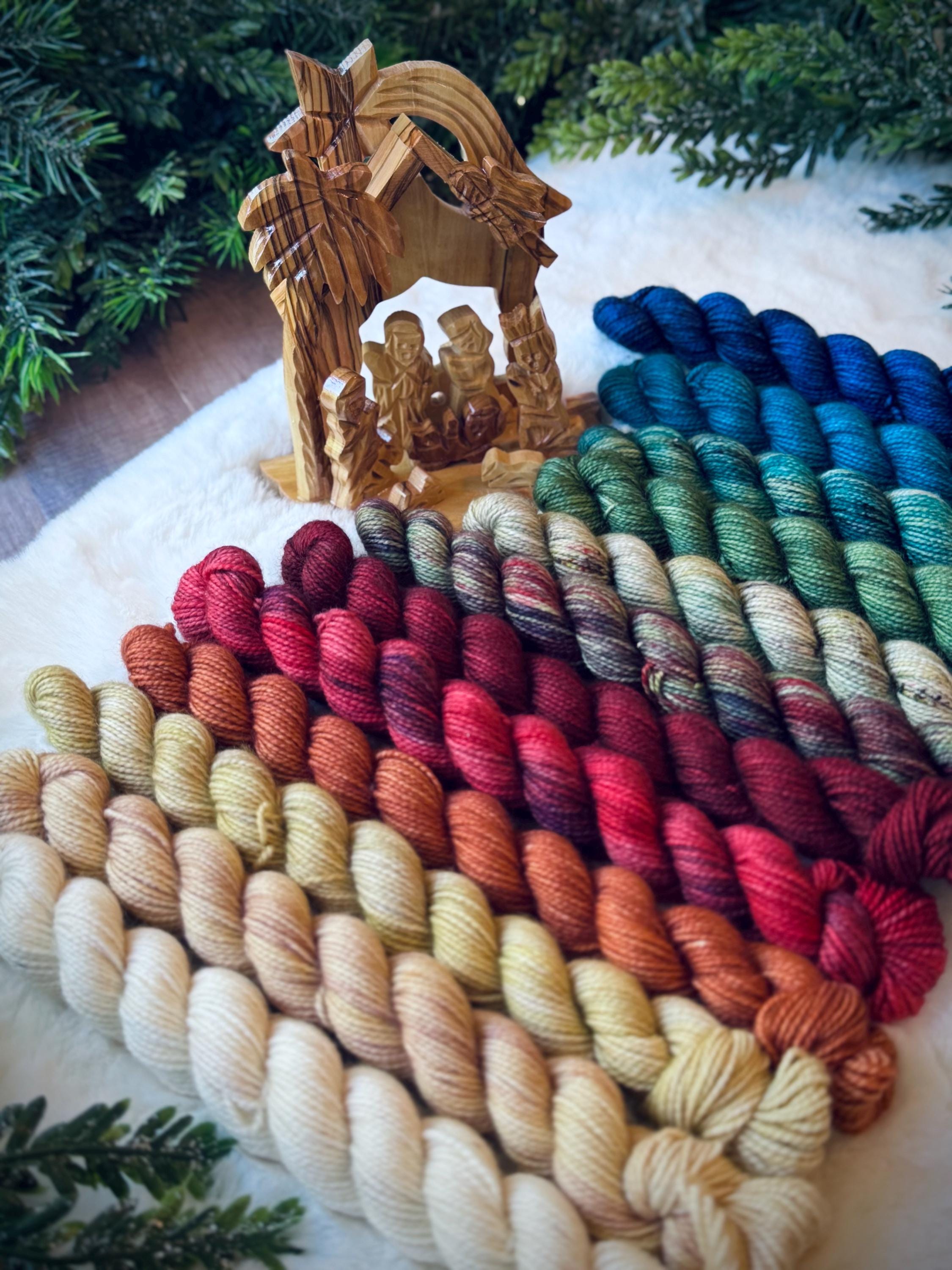 Christmas by the Hearthside is a no-surprise 12-day yarn advent inspired by cozy evenings, candlelight, and the timeless beauty of a classic Christmas with gentle religious themes. Each day reveals a hand-dyed mini skein in richly saturated teals, reds, greens, blues, and golds, just as shown in the photos. Light the fire, pour a cup of cocoa, and let the yarn tell a story of Christmas by the Hearthside.