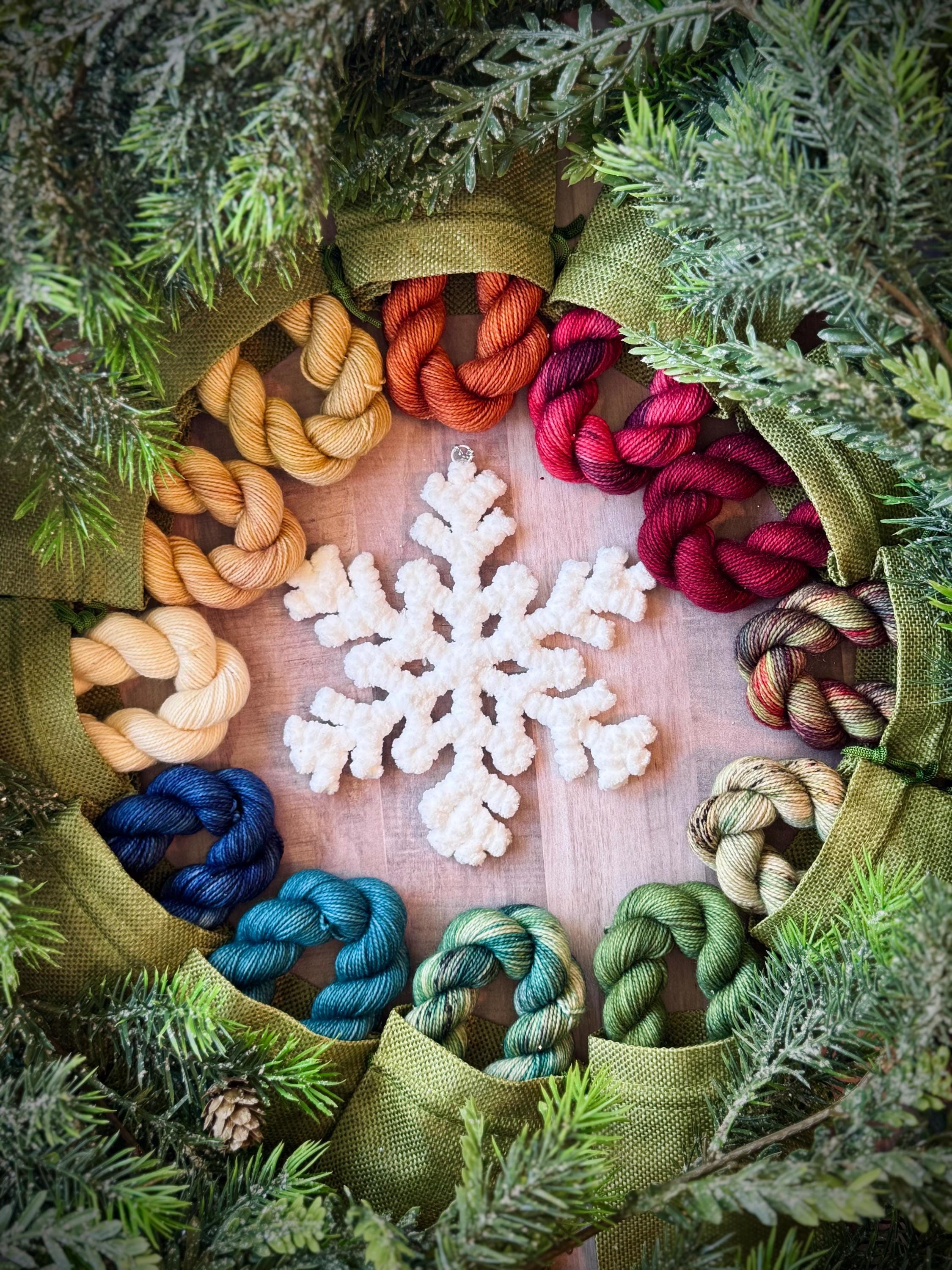 **Please note that this advent calendar is NOT a mystery and is ready to ship. All of the yarns are hand-dyed and therefore, may possibly bleed. I do all I can to ensure this doesn't happen, but it is still possible. Please make sure to hand-wash in lukewarm water with wool wash or a gentle detergent. Never wring to remove water. Squeeze water gently then roll up in a towel and step on the towel to remove excess water. Lay flat to dry on blocking mat or on a towel.