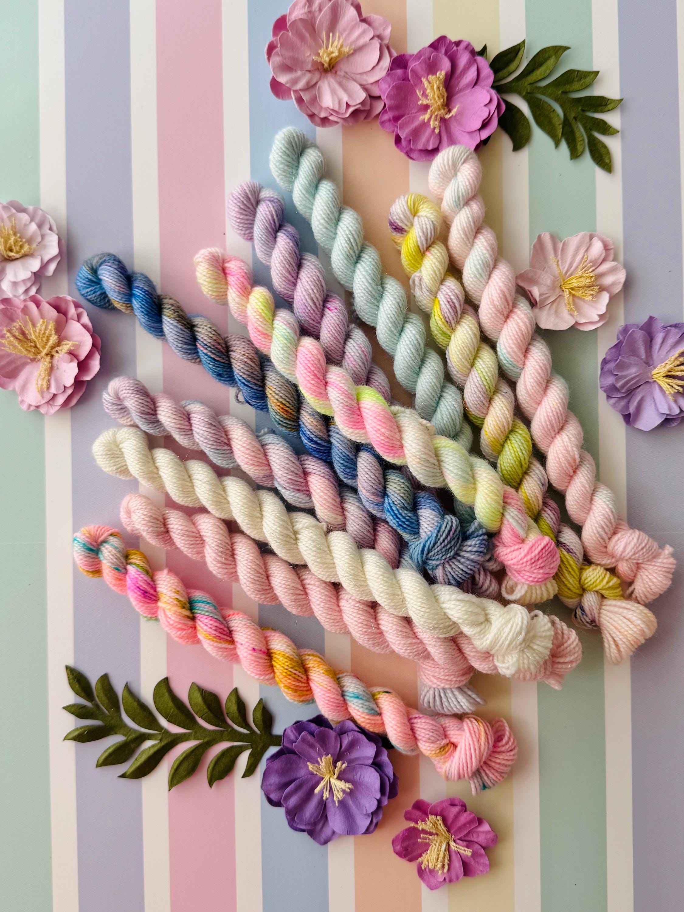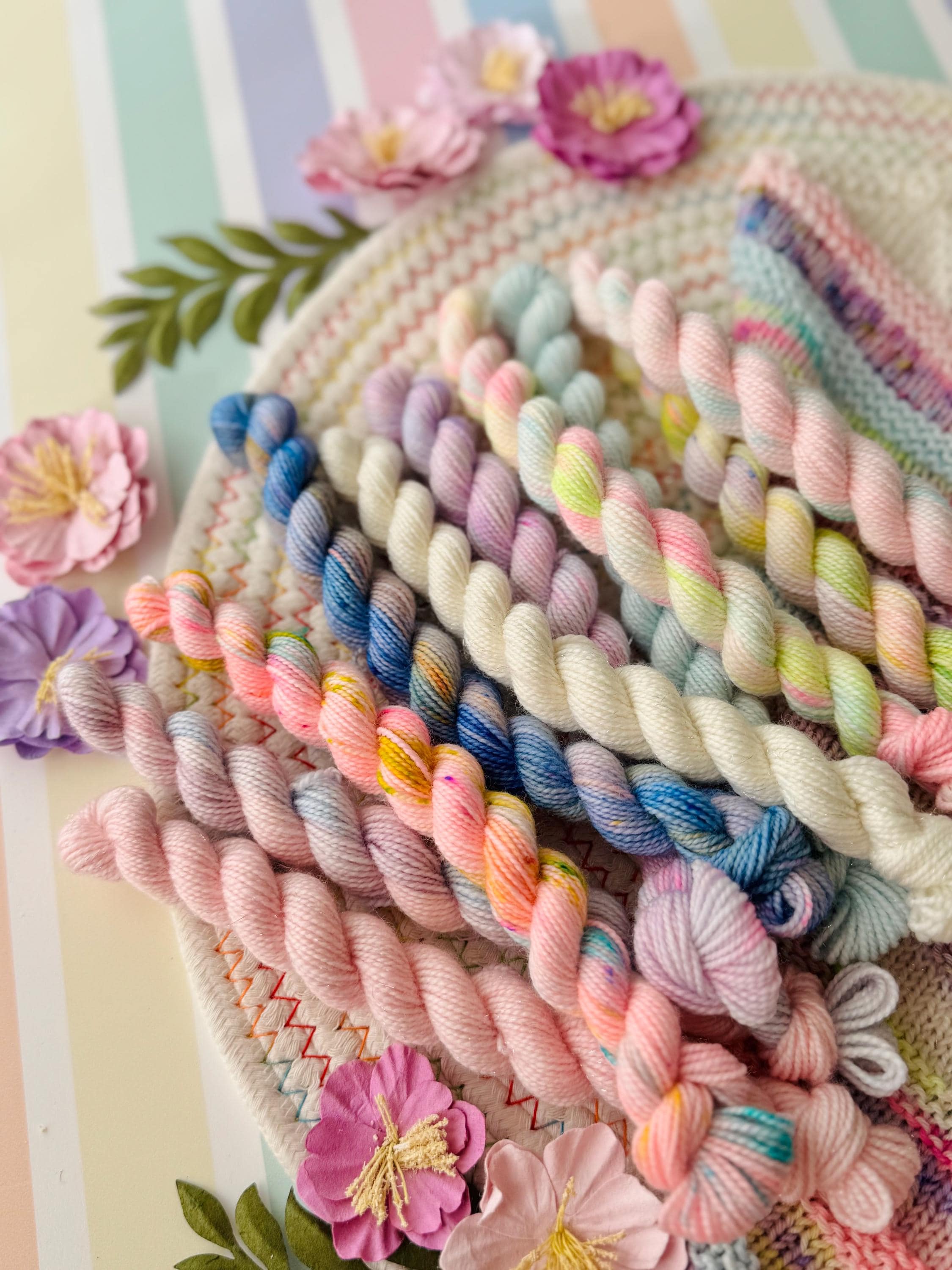Soft, dreamy colors on soft, dreamy wool yarn, with subtle hints of sparkle throughout for you to create a magical project of your own.