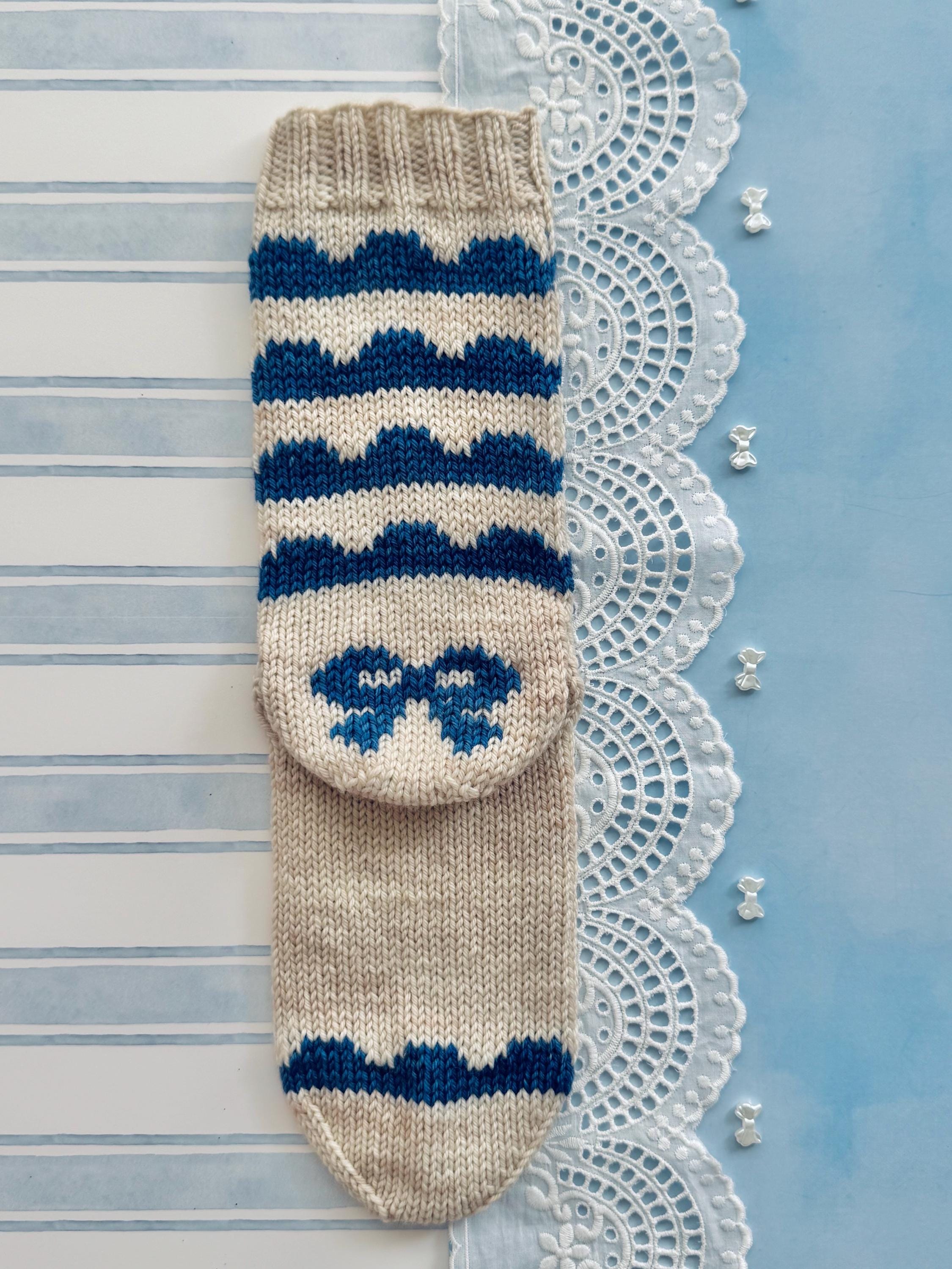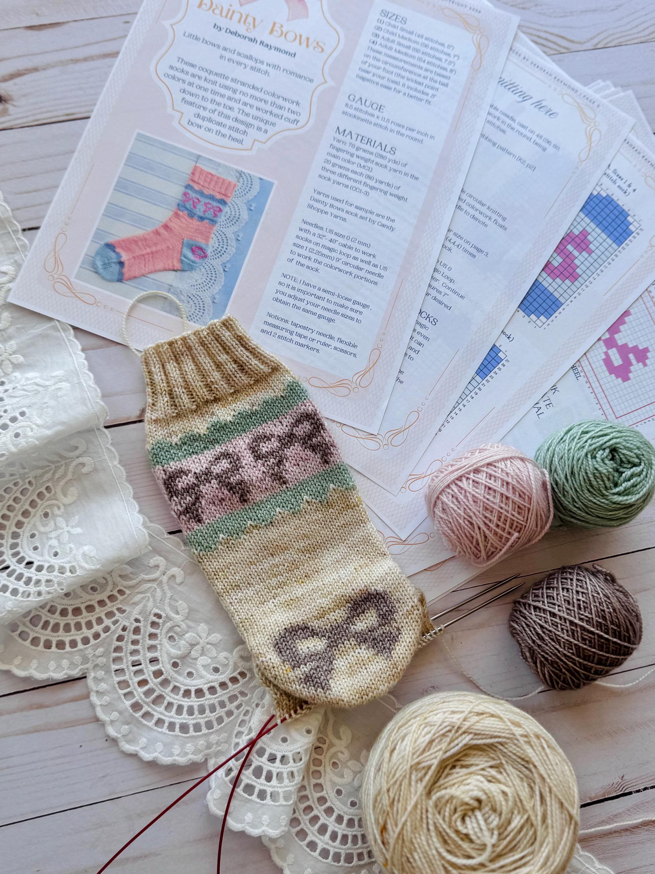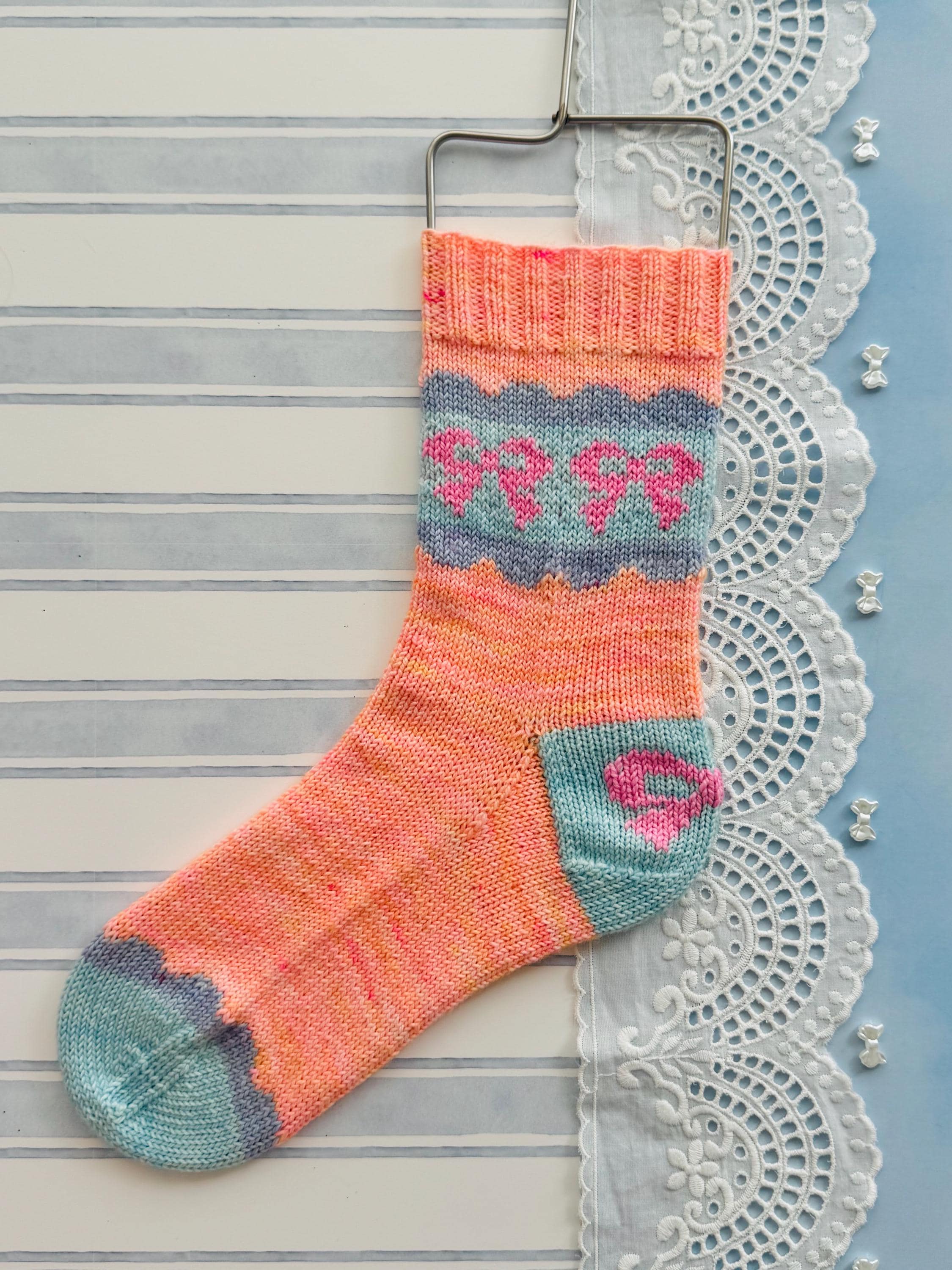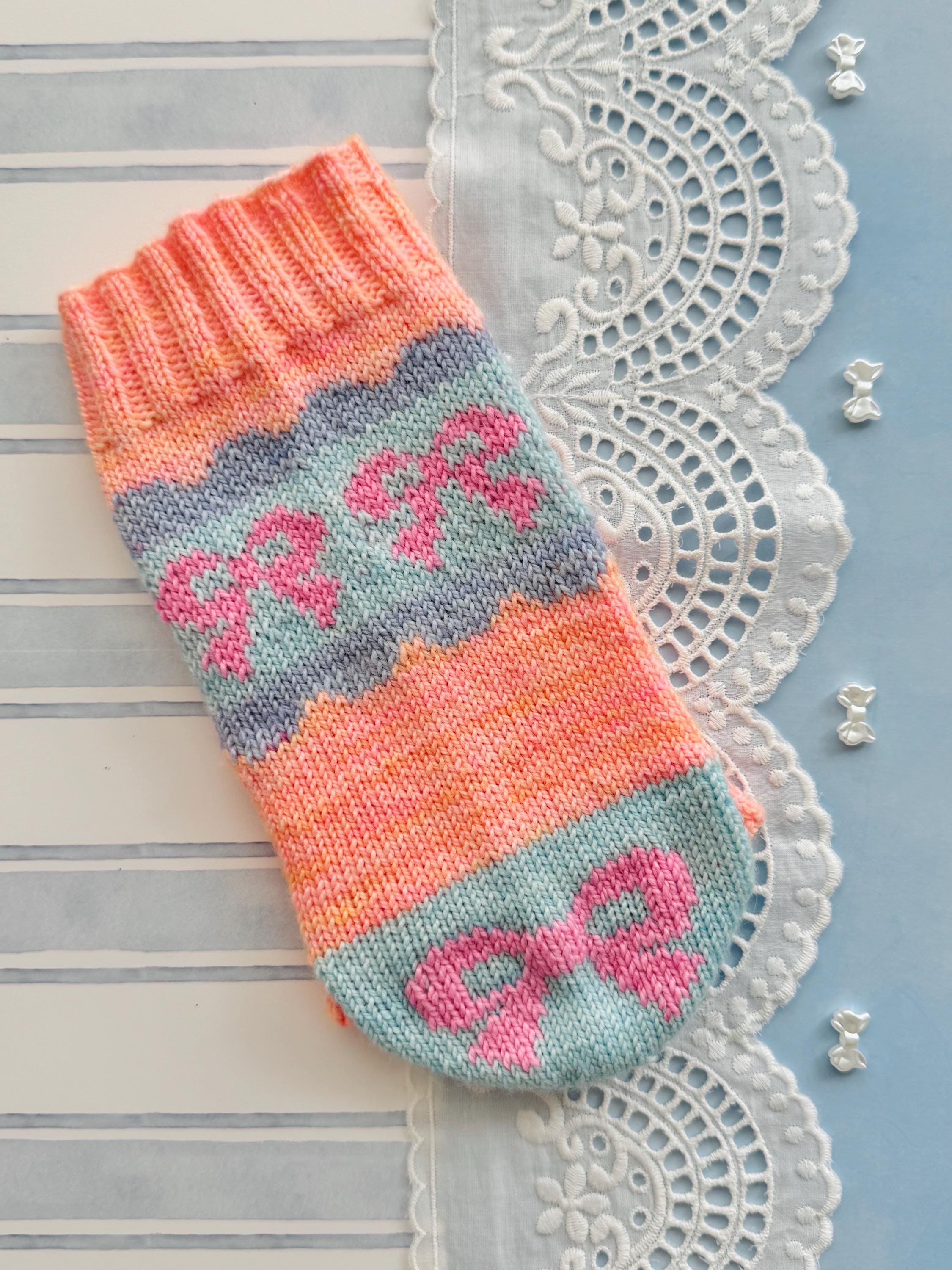 A romantic sock pattern for intermediate knitters, Dainty Bows features elegant scalloped designs, delicate colorwork, and charming duplicate stitch bows on the heels for a beautifully feminine finish.