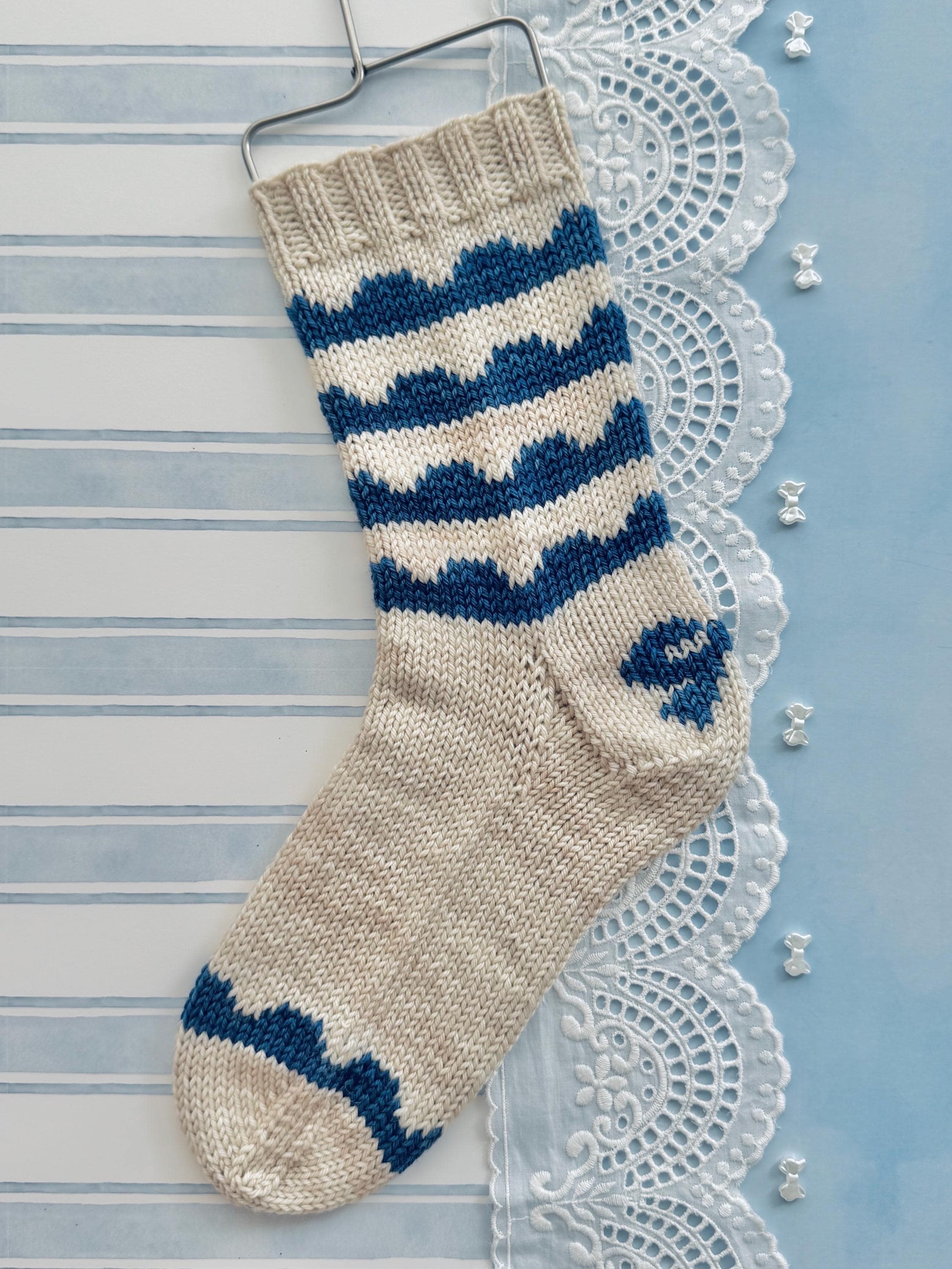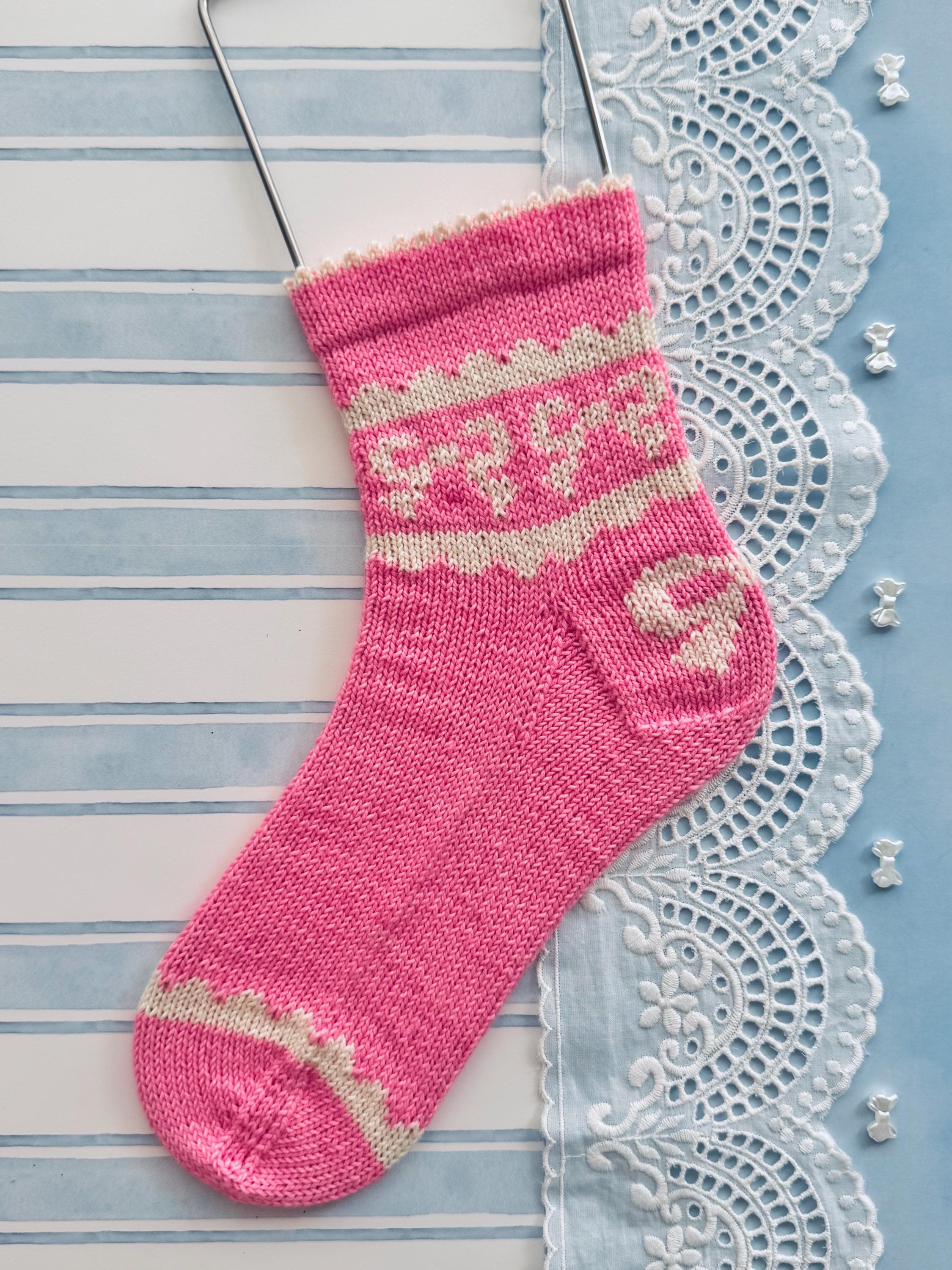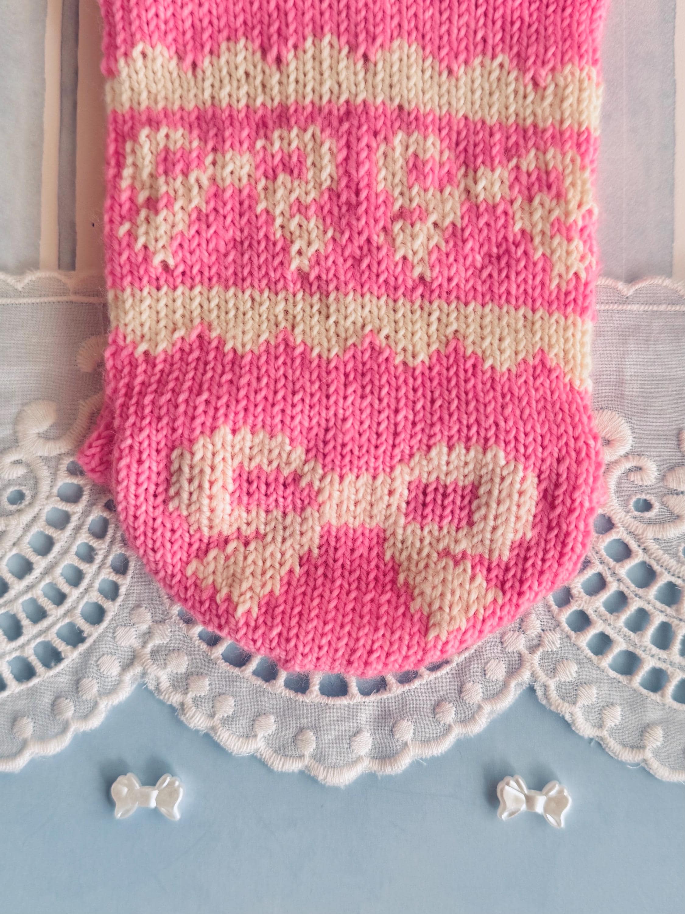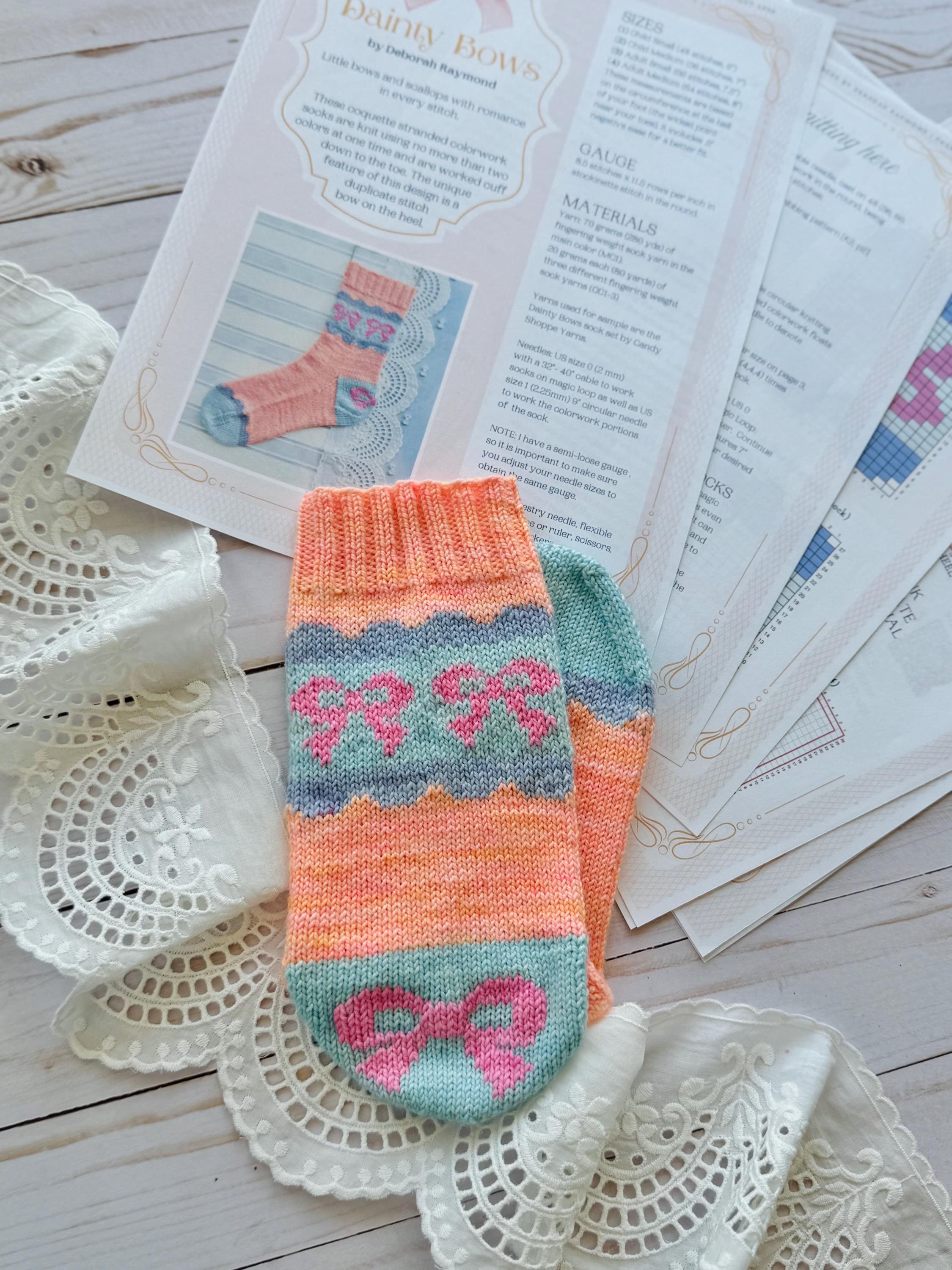 A romantic sock pattern for intermediate knitters, Dainty Bows features elegant scalloped designs, delicate colorwork, and charming duplicate stitch bows on the heels for a beautifully feminine finish.