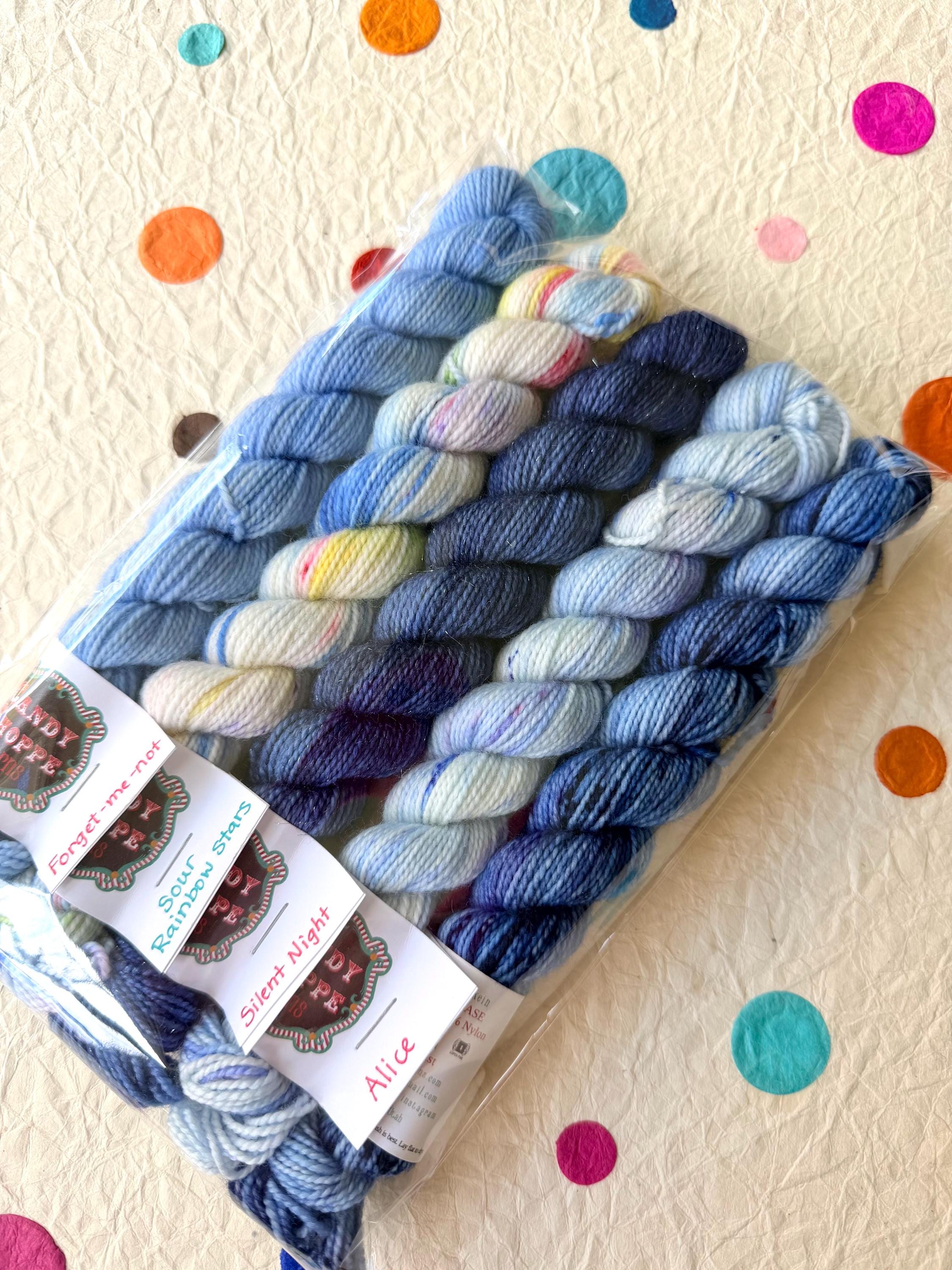 Feeling Blue is a mini skein bundle of various blue minis in the following color ways: