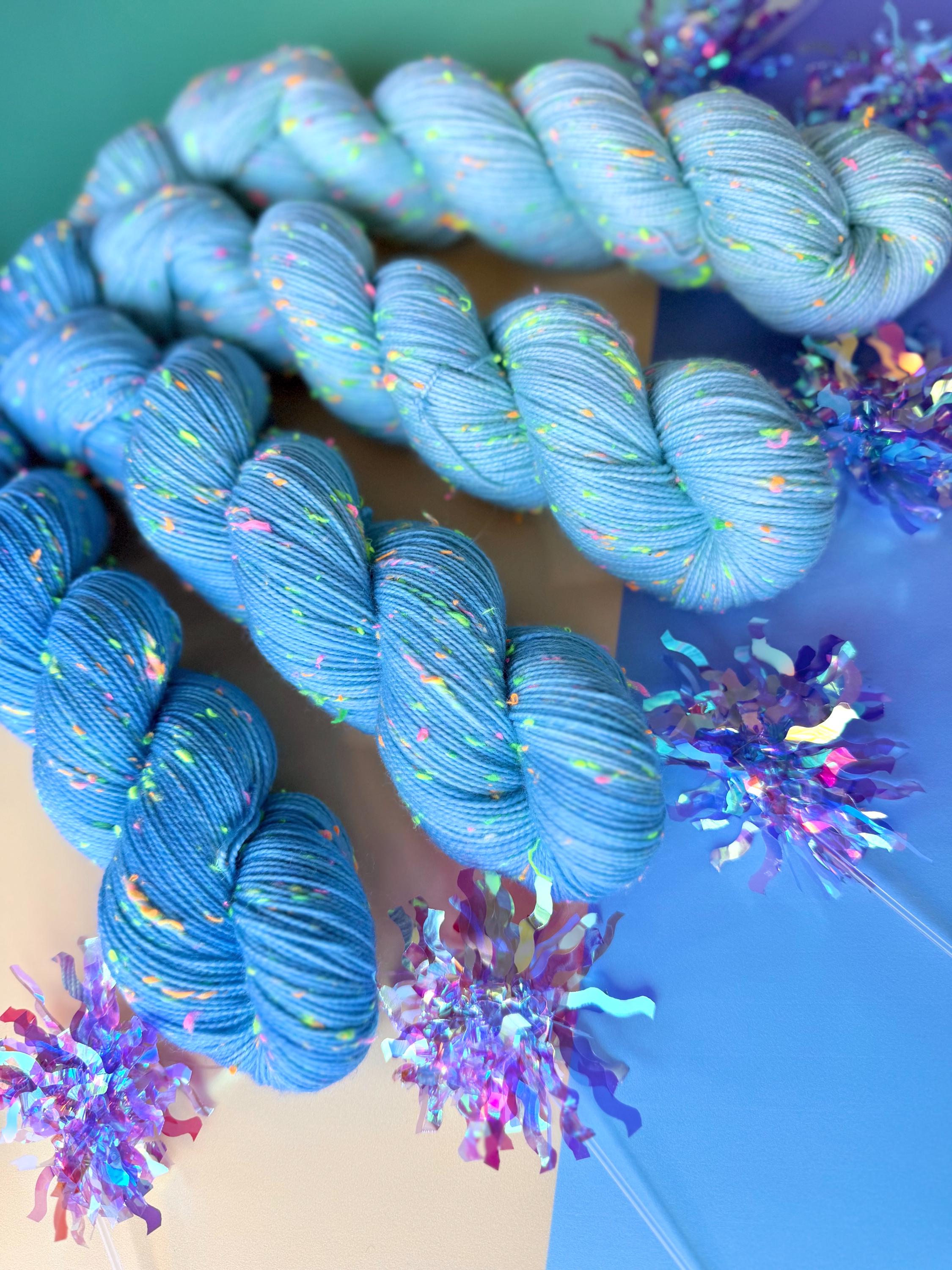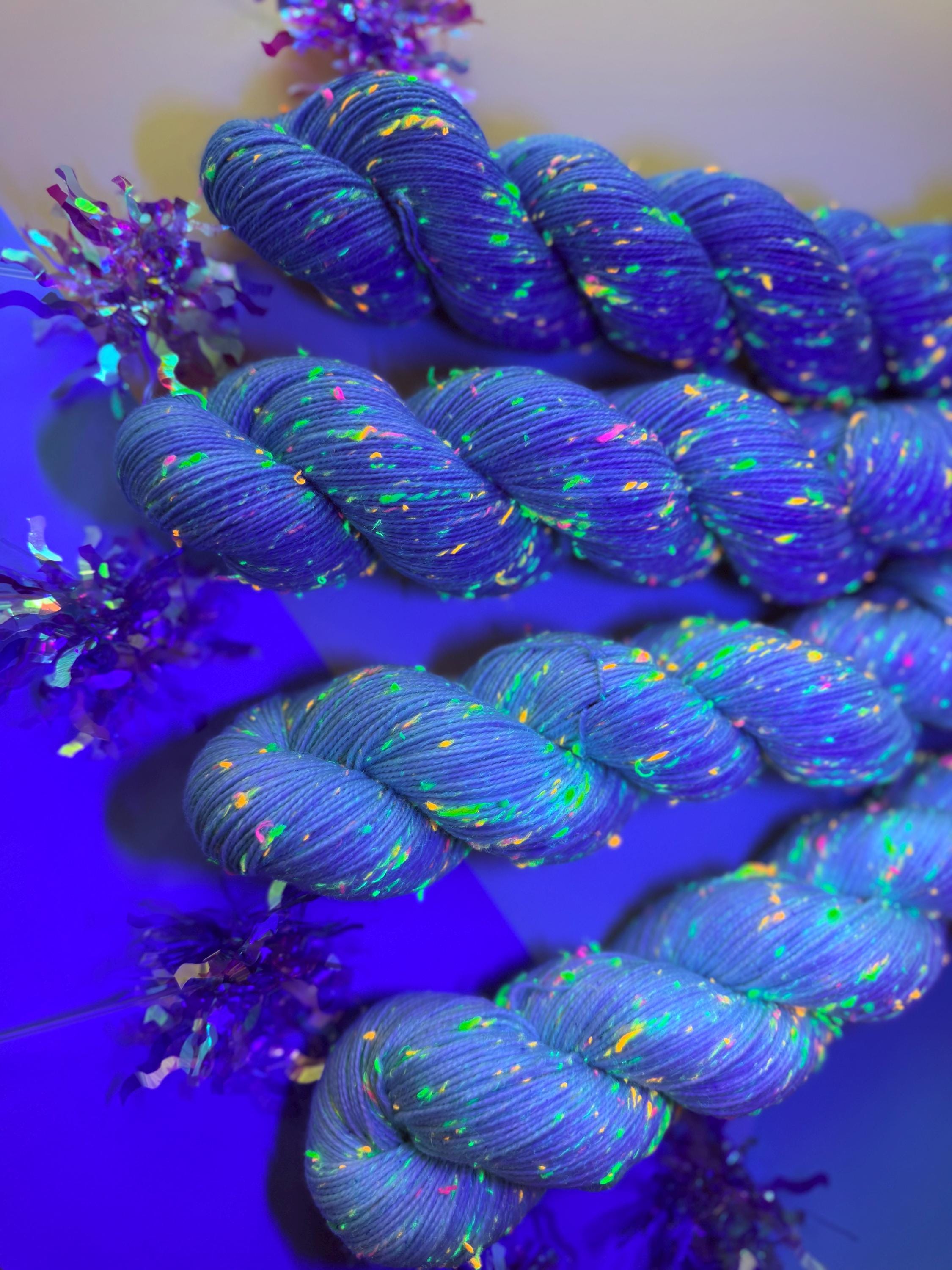 Party like it's 1999 with this fun BLUE MOON FADE, a set of four skeins with neon neps. They glow under a blacklight, but look colorful and fun in the sun! See the third photo of how the yarn looks under a black light.