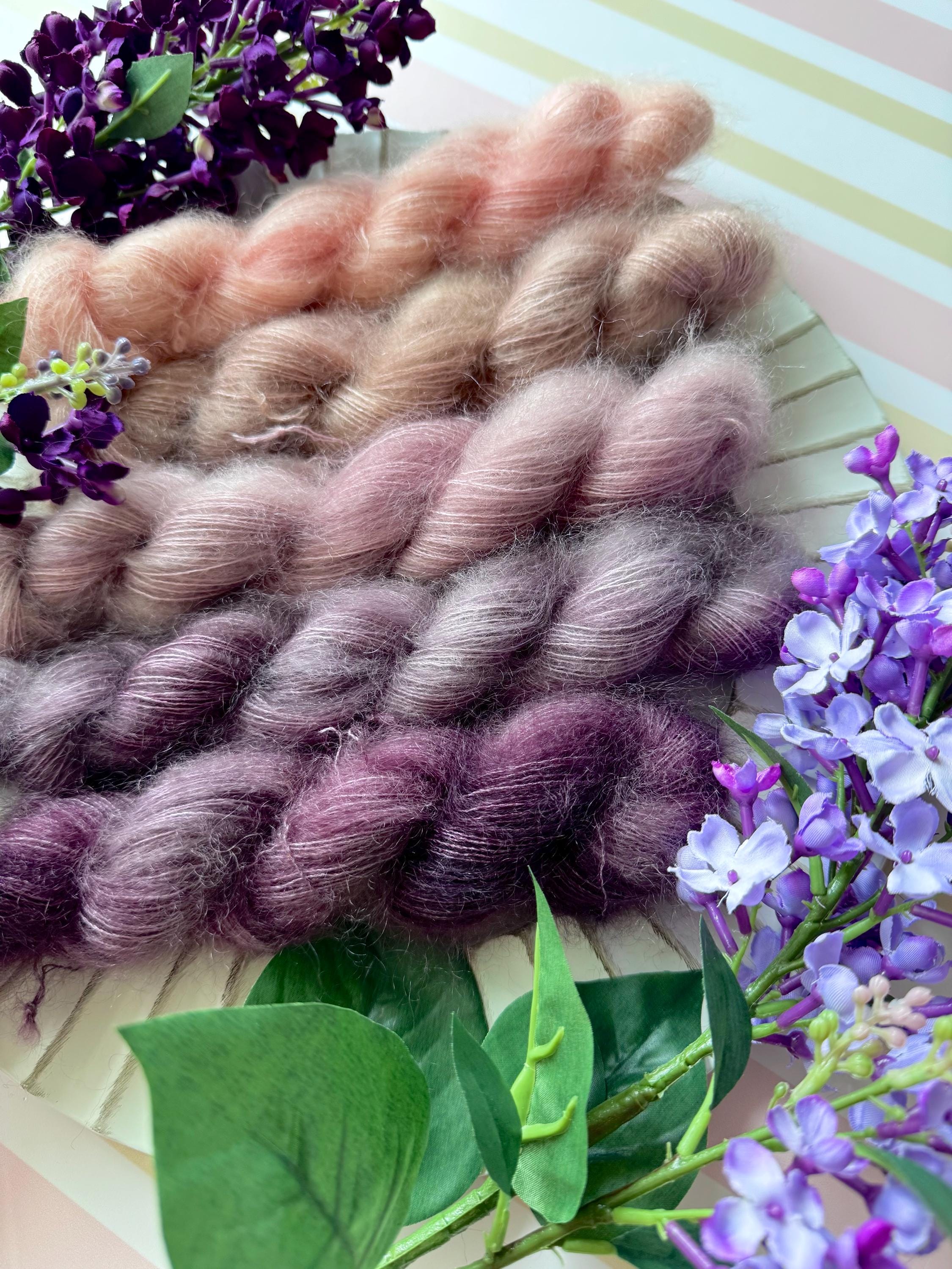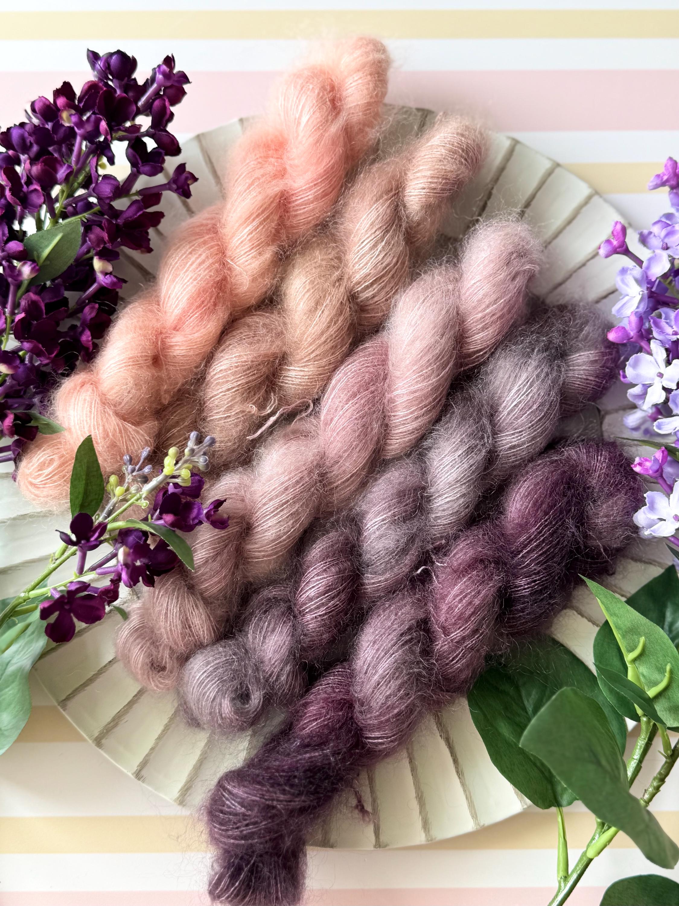 Blushing Lilacs are gossamer strands of soft ultra fine mohair and silk in lace weight yarn as light as cotton candy. As sweet as your childhood dreams.